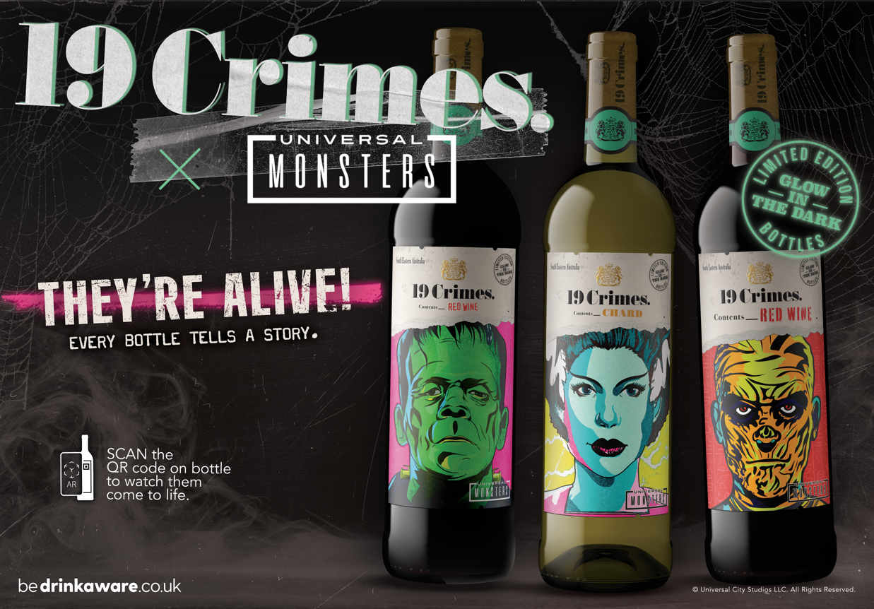 Discover these limited edition Halloween wine bottles from 19 Crimes featuring Frankenstein,Bride of Frankenstein,and The Mummy this spooky season.